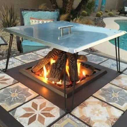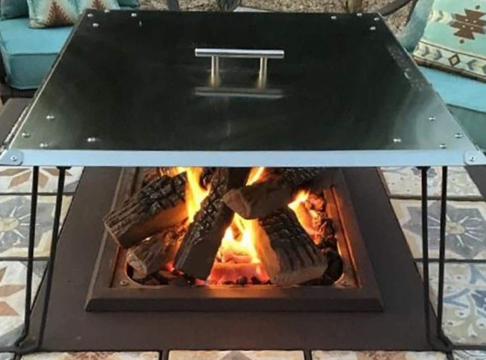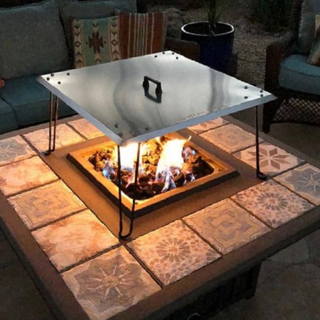 Measuring 24 inches square, it is designed to fit most standard round and square fire pits, offering versatile use.