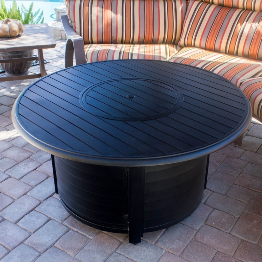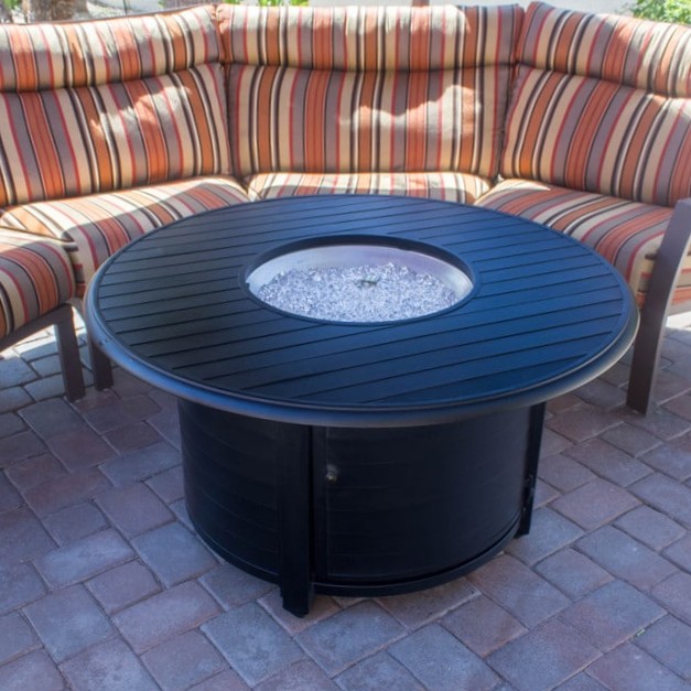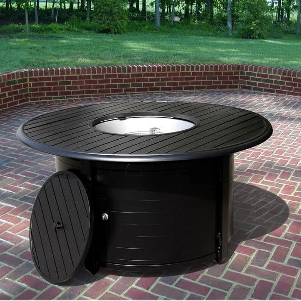 Built around a stainless steel burner buried under beautiful fire glass, this 48 inch round slatted firepit creates quite an impressive silhouette. This stately table is built from weatherproof cast aluminum in a black finish that goes well in almost any backyard design plan. Emitting 41,000 BTUs of heat from a concealed propane tank, this unit also doubles as a table with a burner area lid.