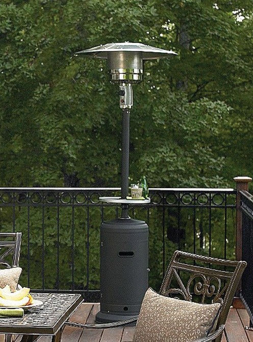 Constructed with high-quality, weather-resistant materials, the Nirvana Patio Heater ensures durability and performance in all conditions. Its user-friendly design offers easy ignition and adjustable heat settings, allowing you to create the perfect ambiance for any outdoor gathering. Elevate your patio experience with the elegant and reliable Nirvana Patio Heater. Not only does this tall outdoor heater emit 48,000 BTUs of warmth in a 10-15’ diameter, it also provides you with an extra table for your patio area. Steel construction ensures that this unit is durable as well as functional. This patio heater includes thermocouple and anti-tilt safety devices, an easy access tank housing door, and wheels for easy mobility.