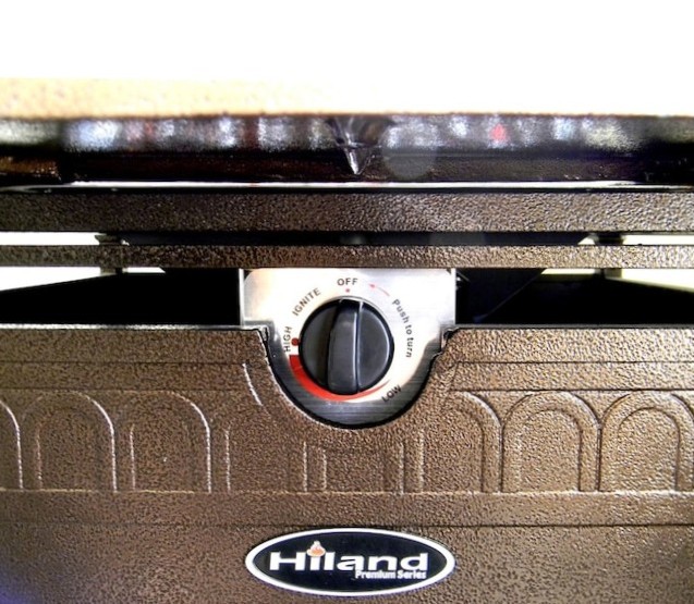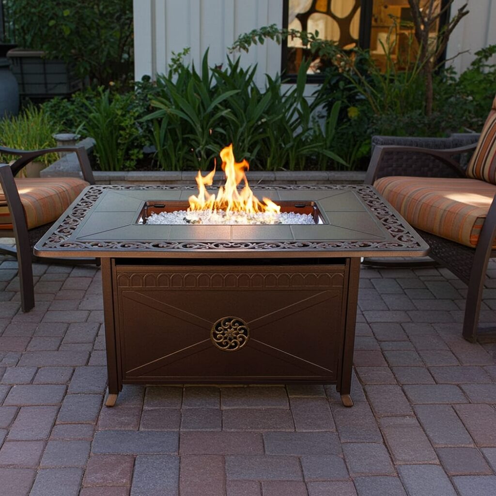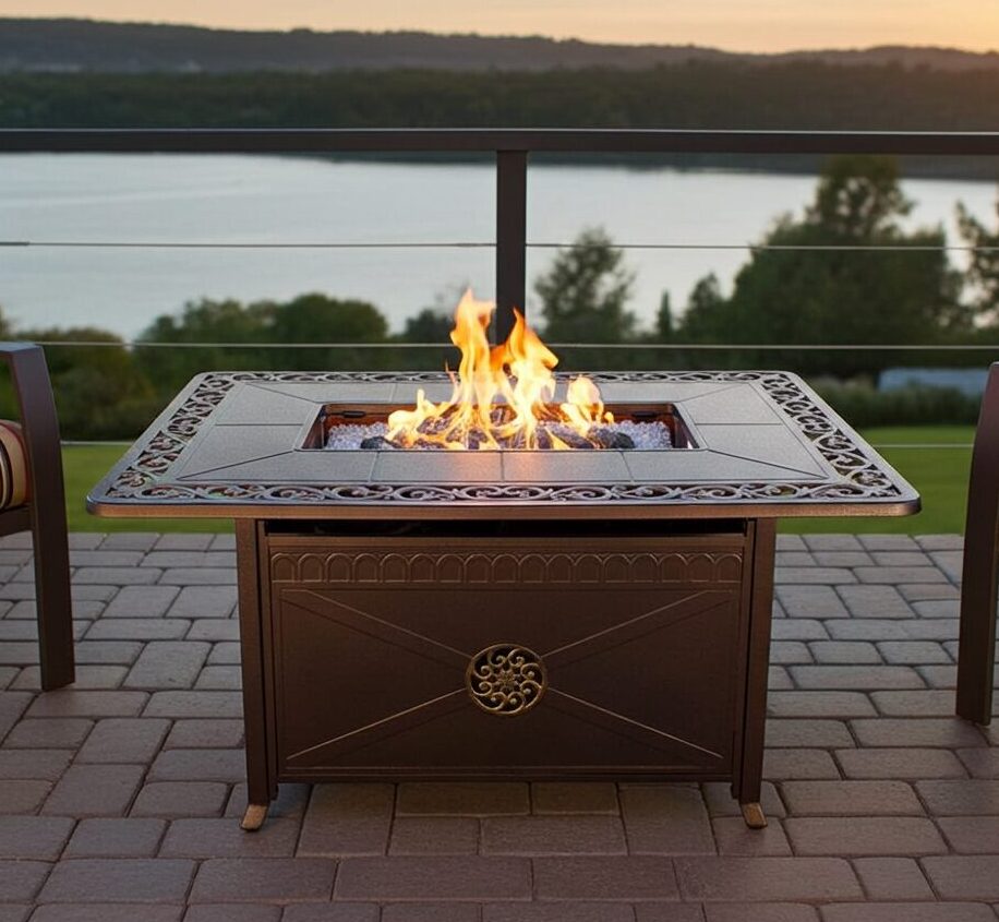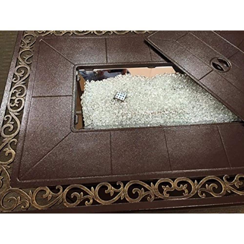 | AZ Patio Heaters Outdoor Propane Aluminum Fire Pit with Scroll Design | 42,000 Flux: 450g-870g/hour | Cast Aluminum in Hammered Bronze Finish with gold accents | Tabletop size: 49" x 35" x 24" | Burner area lid included Includes starter kit of clear fireglass | Integrated Ignition | CSA approved | 1 year limited | This product can expose you to chemicals including Lead and Lead Compounds, which are known to the state of California to cause cancer, and Carbon Monoxide, Lead and Lead Compounds which are known to the state of California to cause birth defects or other reproductive harm. For more information go to www.P65Warnings.ca.gov |