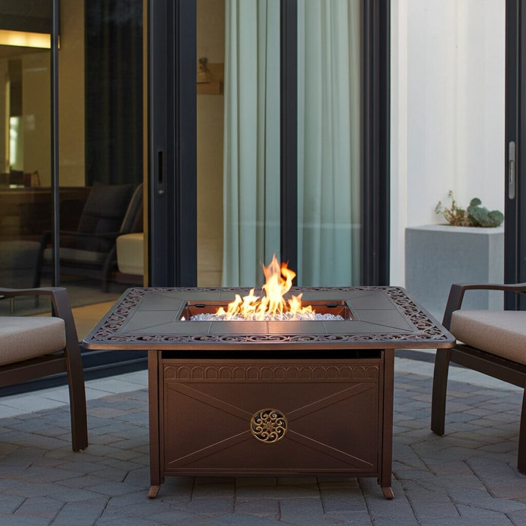This fire pit reveals a unique style that can add a touch of elegance to your backyard in just seconds with its beautiful scroll design, brushed with touches of gold. This rectangular hammered bronze fire pit works to keep your entertainment area warm and glowing during any outdoor event. Featuring the gorgeous paneled top and sides of the fire pit, this unit is the perfect pair for any decor. The propane fueled fire pit does not require land line hookup; simply connect to a standard 20 gallon propane tank that is easily concealed inside the fire pit itself. Ready for outdoor environments, this fire pit hosts a heavy duty paneled construction that adds certain classic style and durability that is sure to attract attention.