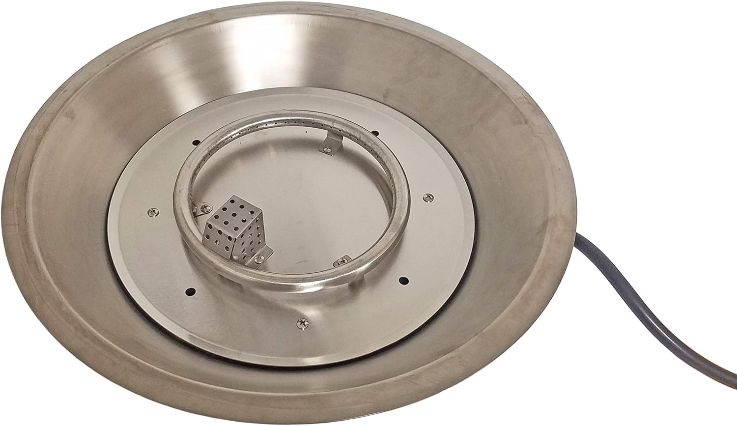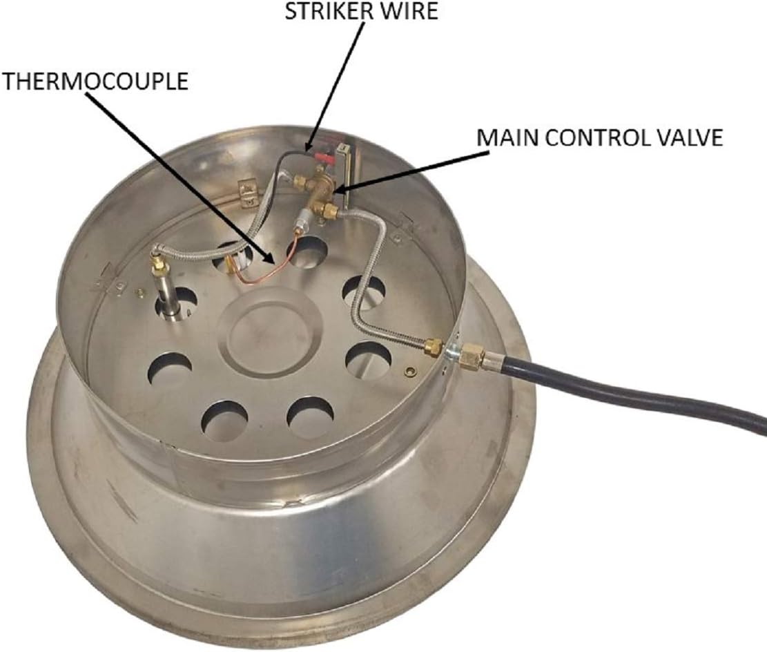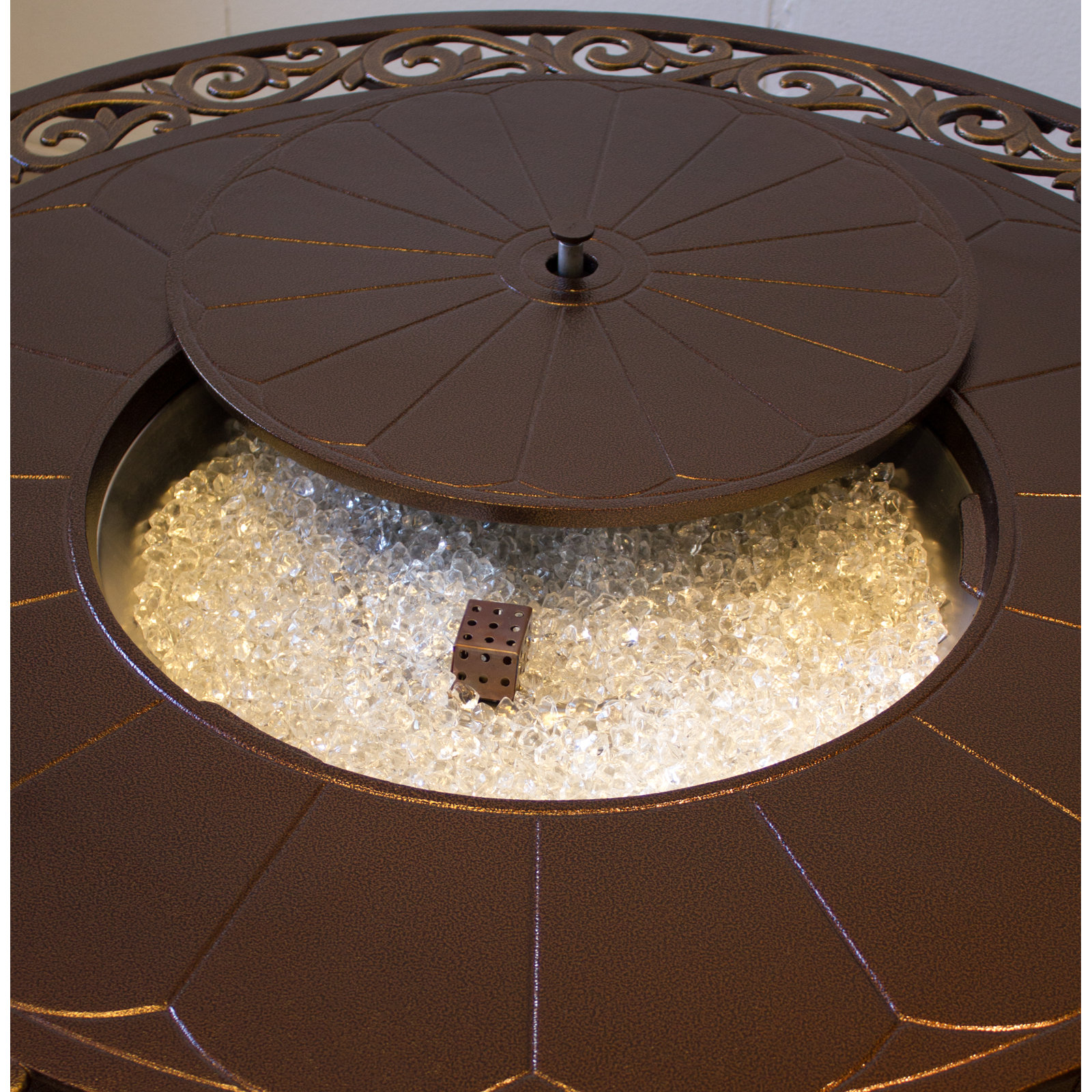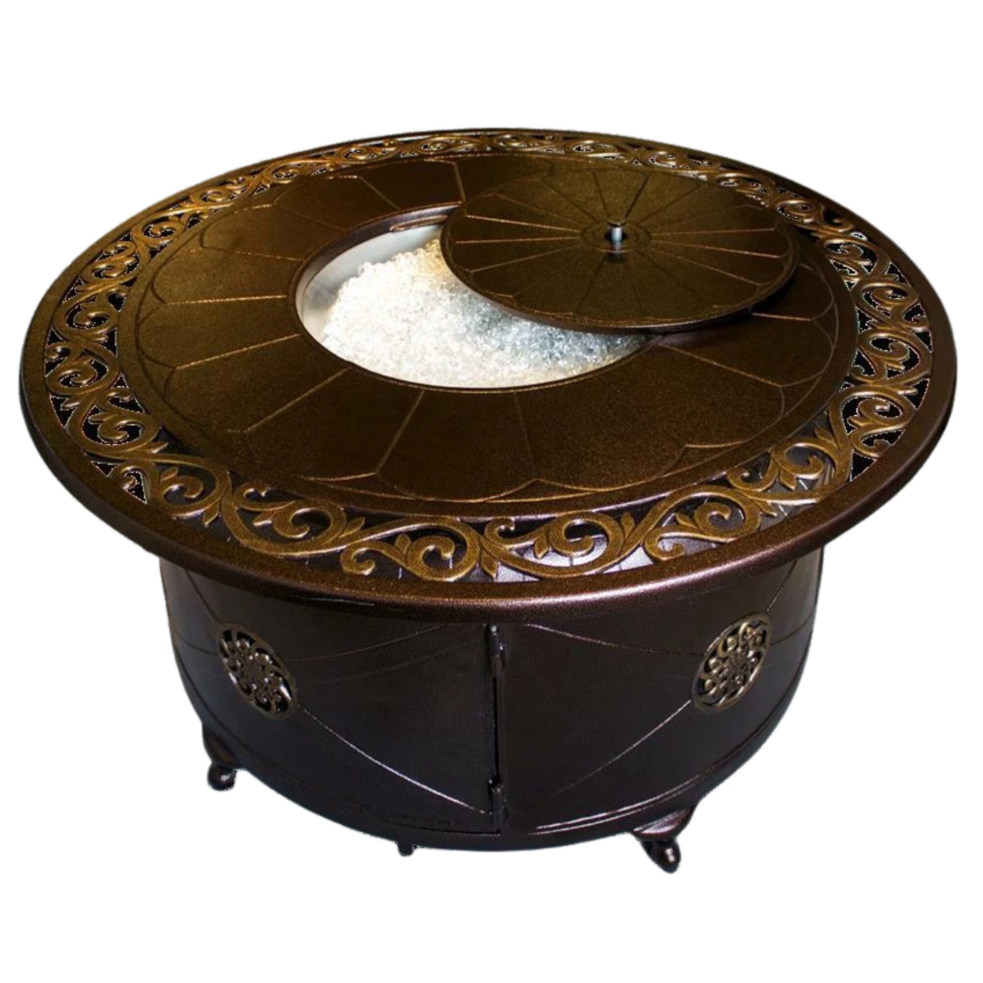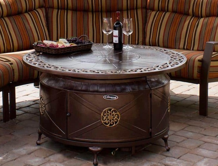 | AZ Patio Heaters Outdoor Round Aluminum Propane Fire Pit with Scroll Design | 42,000 Heating area: approx. 15ft Diameter | 48" diameter tabletop, 23" tall 20" diameter lid, 19" diameter burn area | Gas type: Propane | Easy access propane tank door Thermocouple flame failure device Piezoelectric ignition | CSA approved | Includes starter kit of clear fireglass | 1 year limited | Metal Hammered Bronze Finish | This product can expose you to chemicals including Lead and Lead Compounds, which are known to the state of California to cause cancer, and Carbon Monoxide, Lead and Lead Compounds which are known to the state of California to cause birth defects or other reproductive harm. For more information go to www.P65Warnings.ca.gov |