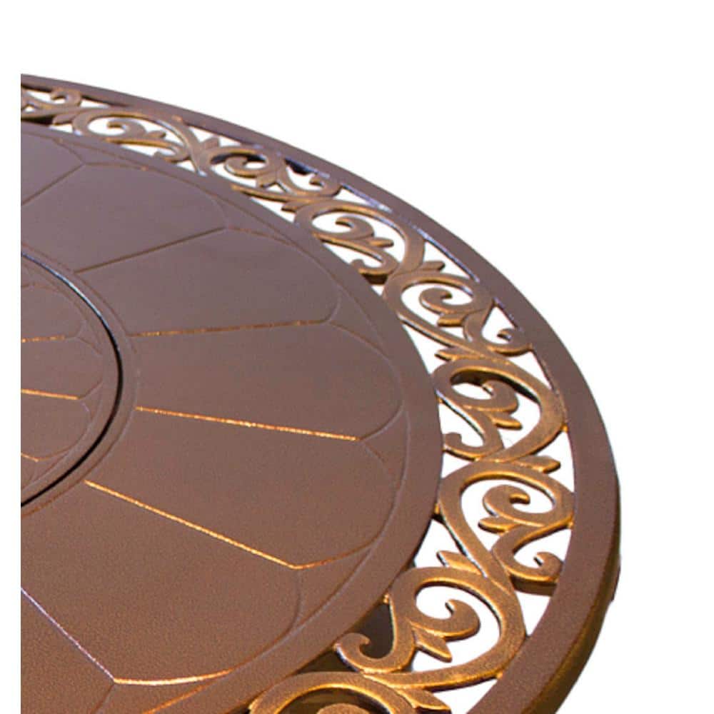 Add a little elegance to your backyard with this 48″ round cast aluminum firepit with a decorative scroll design of hammered bronze and a touch of gold. In weatherproof cast aluminum, this intricately attractive table centers around a stainless steel burner that emits 41,000 BTUs and a bowl full of glass fire beads. Easily conceal the 20lb. propane tank used to run the fire pit under the unit itself.