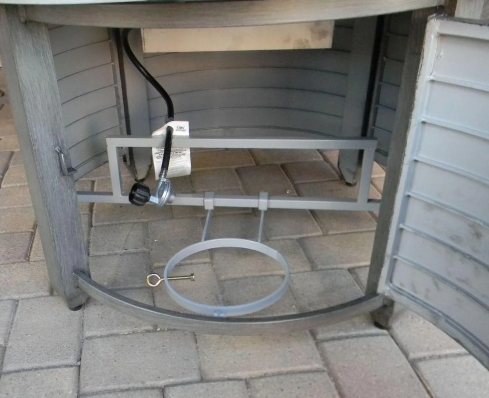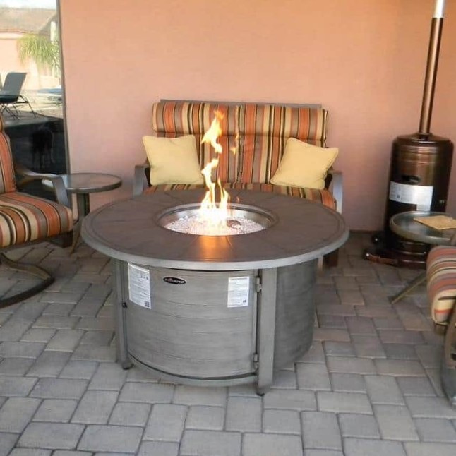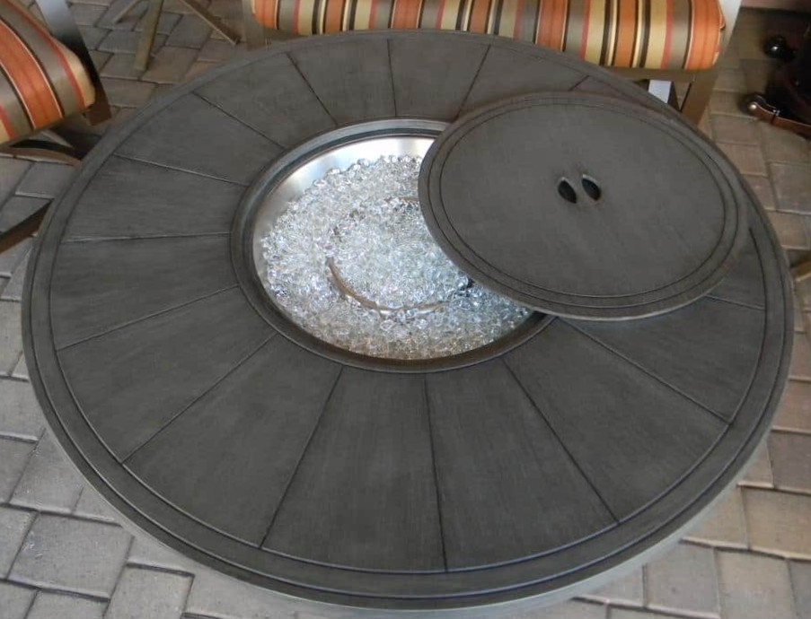 Built around a stainless steel burner buried under beautiful fire glass, this grey brushed wood finished firepit creates quite an impressive silhouette. This stately table is built from weatherproof cast aluminum in a grey finish that goes well in almost any backyard design plan. Emitting 42,000 BTUs of heat from a concealed propane tank, this unit also doubles as a table with a burner area lid.